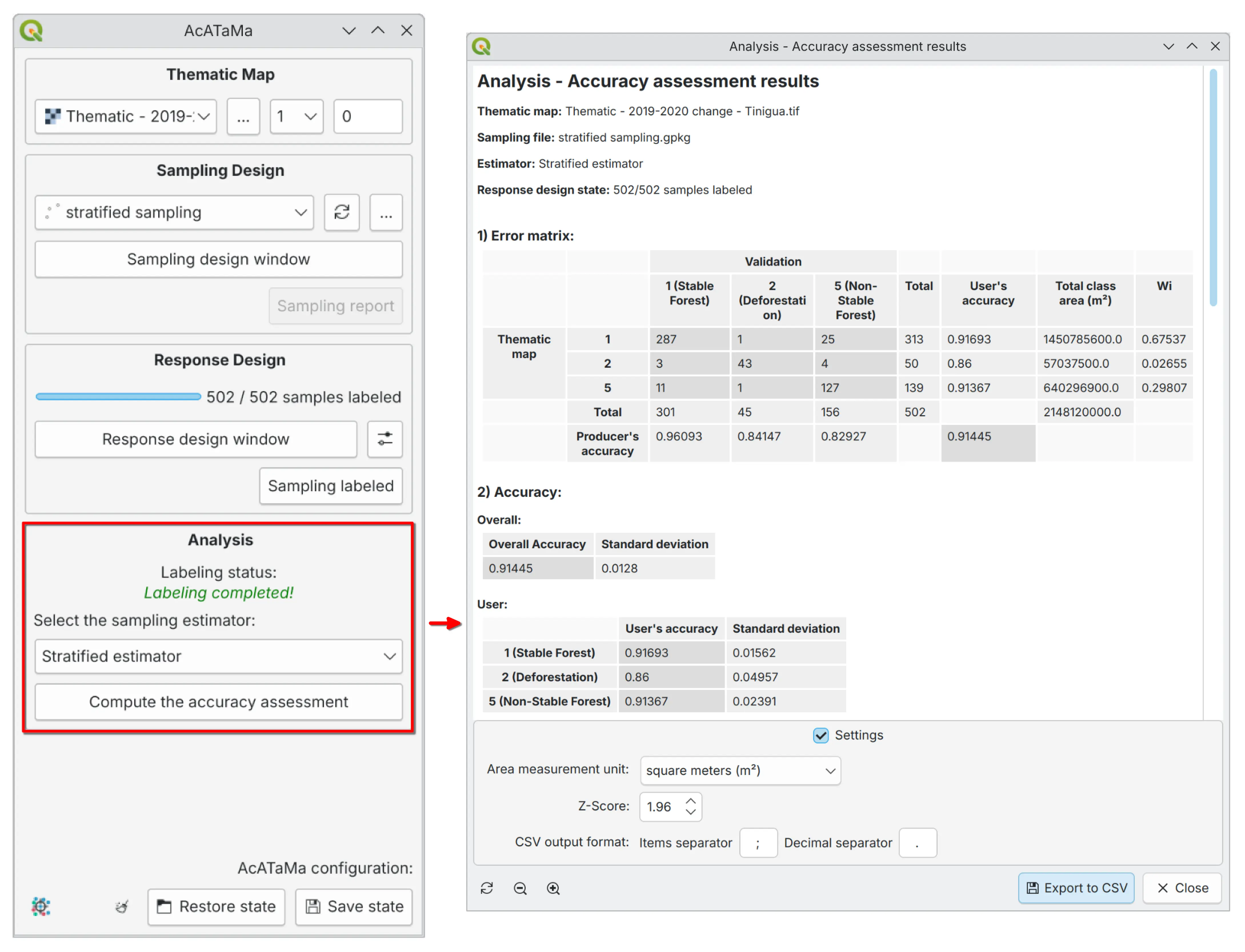 Based on the importance of accuracy and area estimation adjustments and recommendations, AcATaMa provides a comprehensive set of analysis results calculated according to the selected sampling design:
