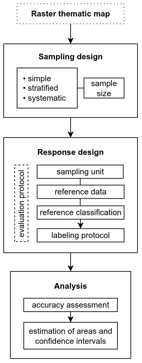 The accuracy assessment of thematic maps consists of three key components: sampling design, response design, and analysis. AcATaMa integrates these components through a structured, sequential workflow.