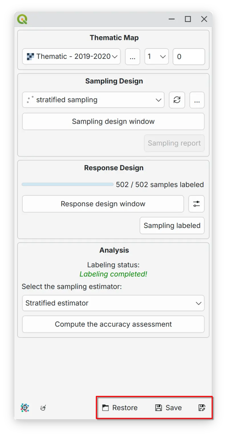 AcATaMa supports session persistence through save and restore functionality that captures your complete workspace state. This capability is essential for multi-session workflows where you need to maintain consistency across accuracy assessment periods.