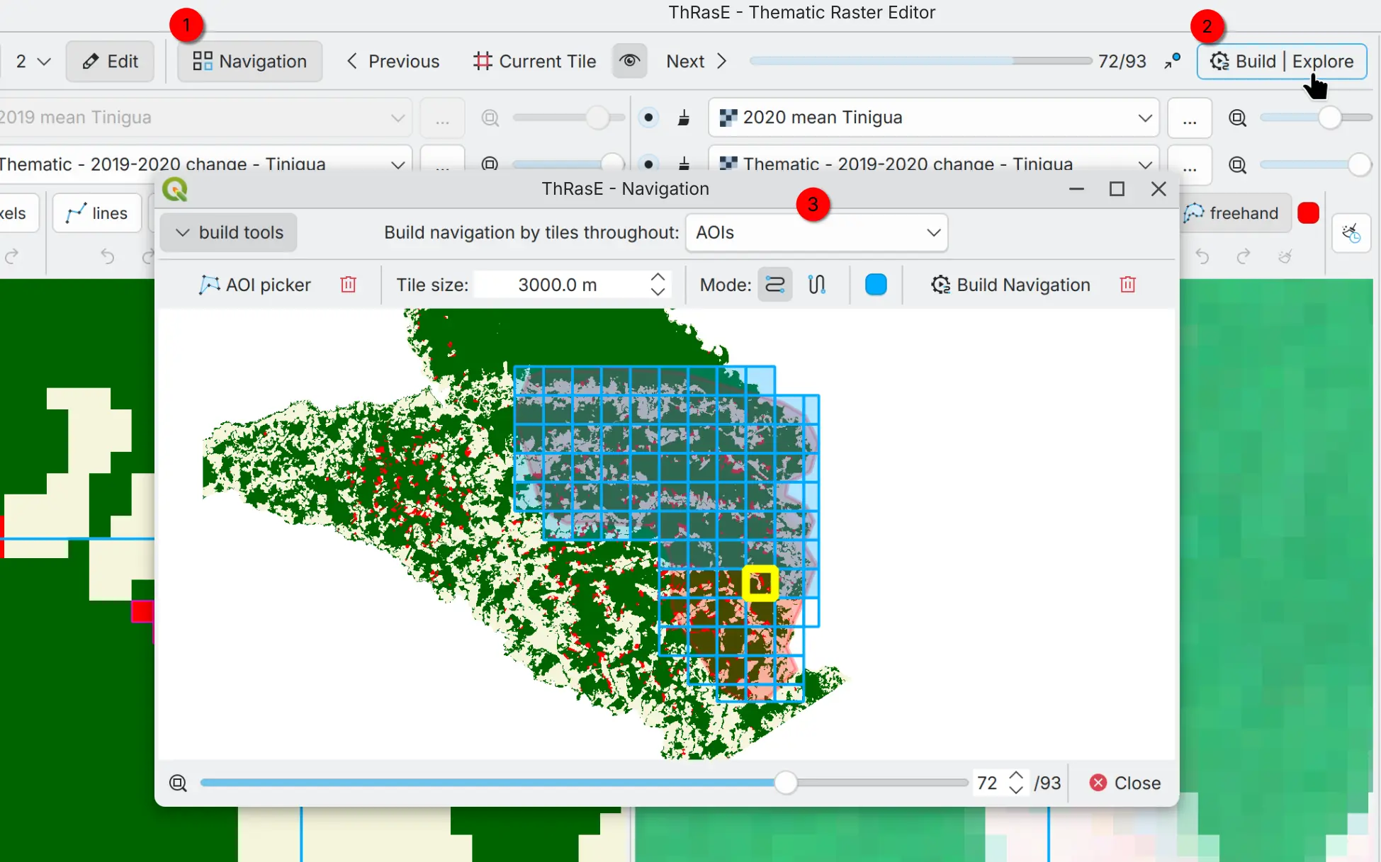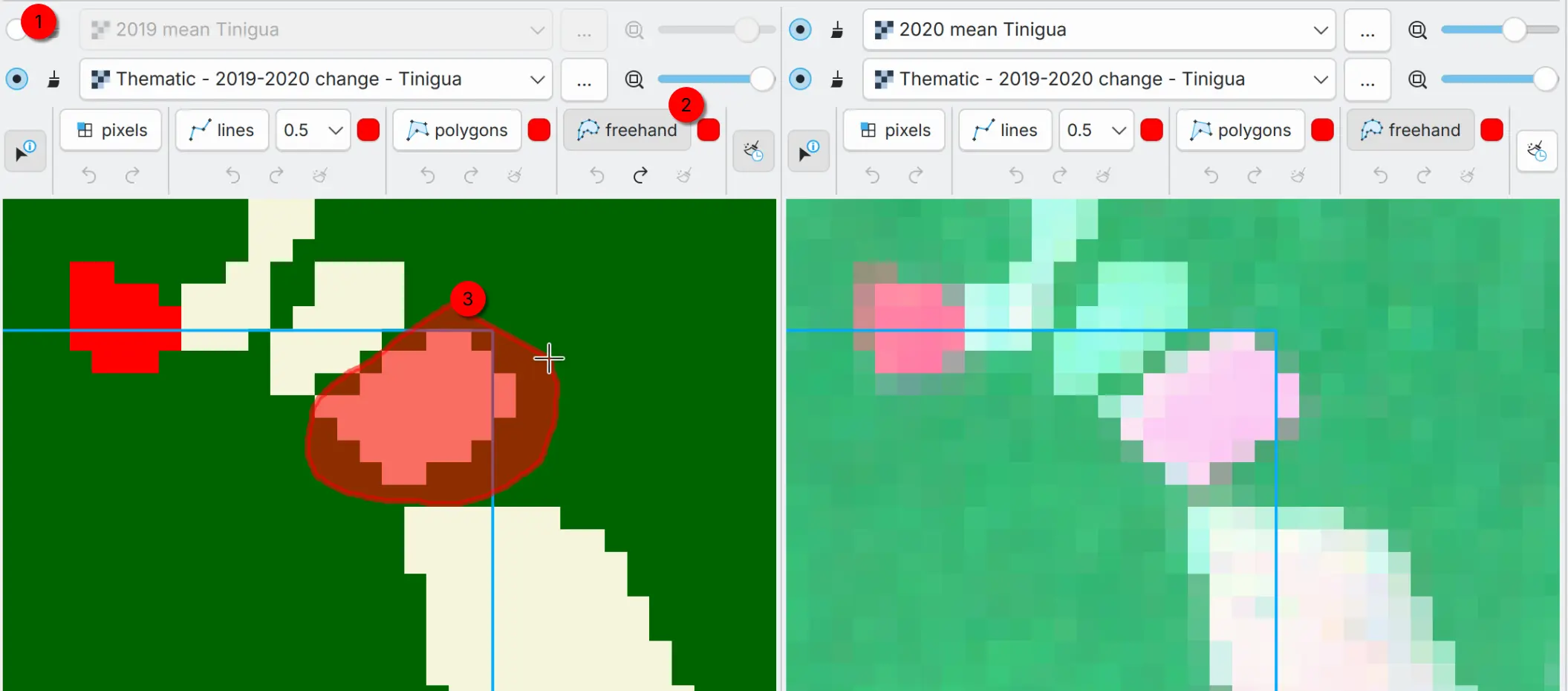 You can apply the recode pixel table with the editing tools based on your needs and in specific areas of the thematic map. First, optionally, you can disable or adjust the transparency of a layer that is covering the thematic map to better visualize the editing areas (1). Then, pick an editing tool (2) and start editing the thematic map (3). The functionality and options depend on the editing tool you choose (see the tooltips for controls). Each editing tool has its own undo and redo history, so you can edit safely and step back if something is not right.