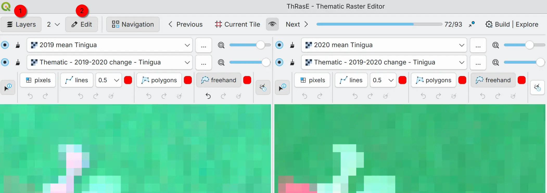 You can show/hide the Layers and Edit tool toolbars. In the Layers toolbar (1) you can add or change an image layer to visualize in the multi-view panels. The Edit toolbar (2) is available in every view to edit the thematic map.