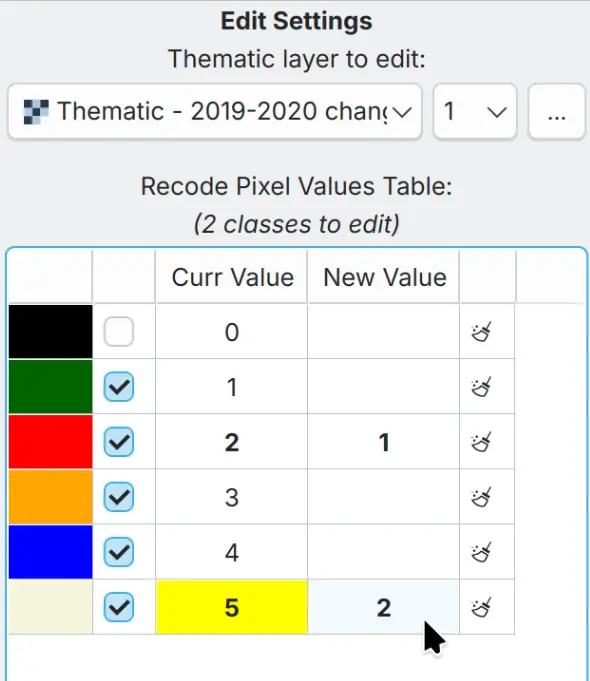 You can edit the thematic map with the Recode pixel table. The demo configuration (this is just an example and not an official configuration) shows a recode pixel table to change class 2 (Deforestation) to class 1 (Stable Forest) and class 5 (Non-Stable Forest) to class 2 (Deforestation). This means you can change multiple classes at once in a single operation.