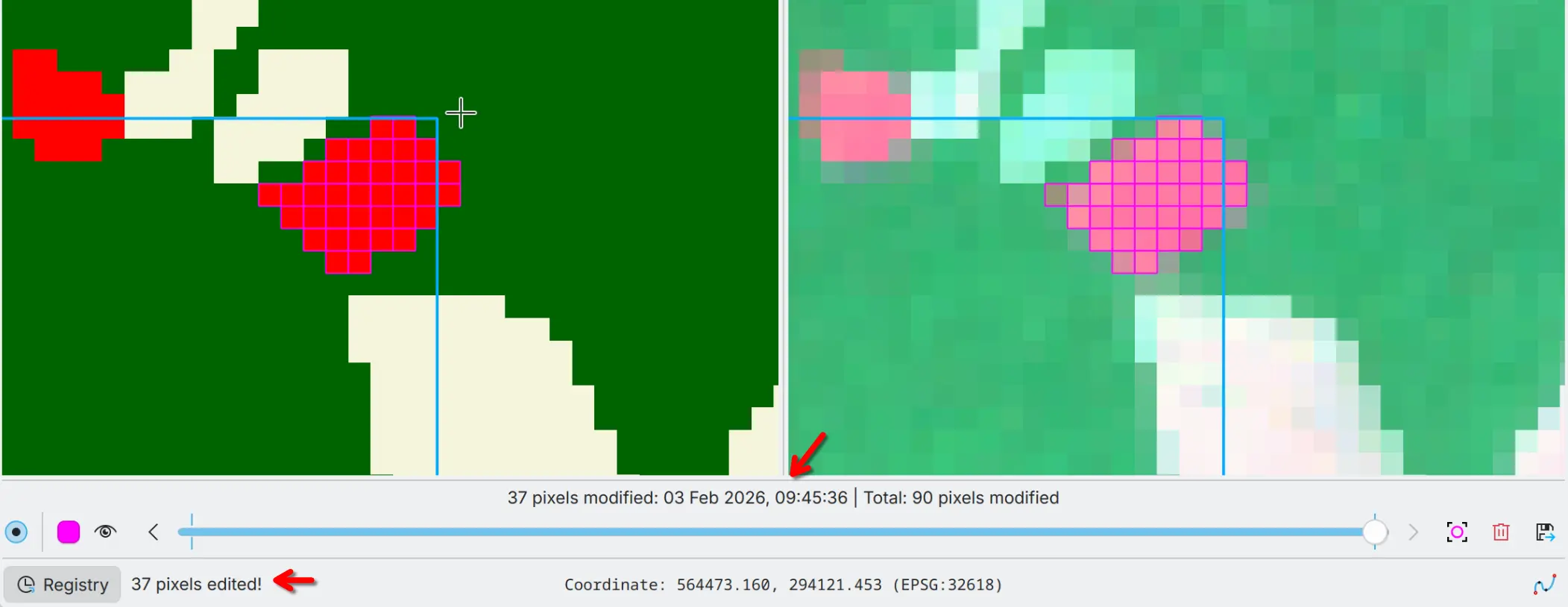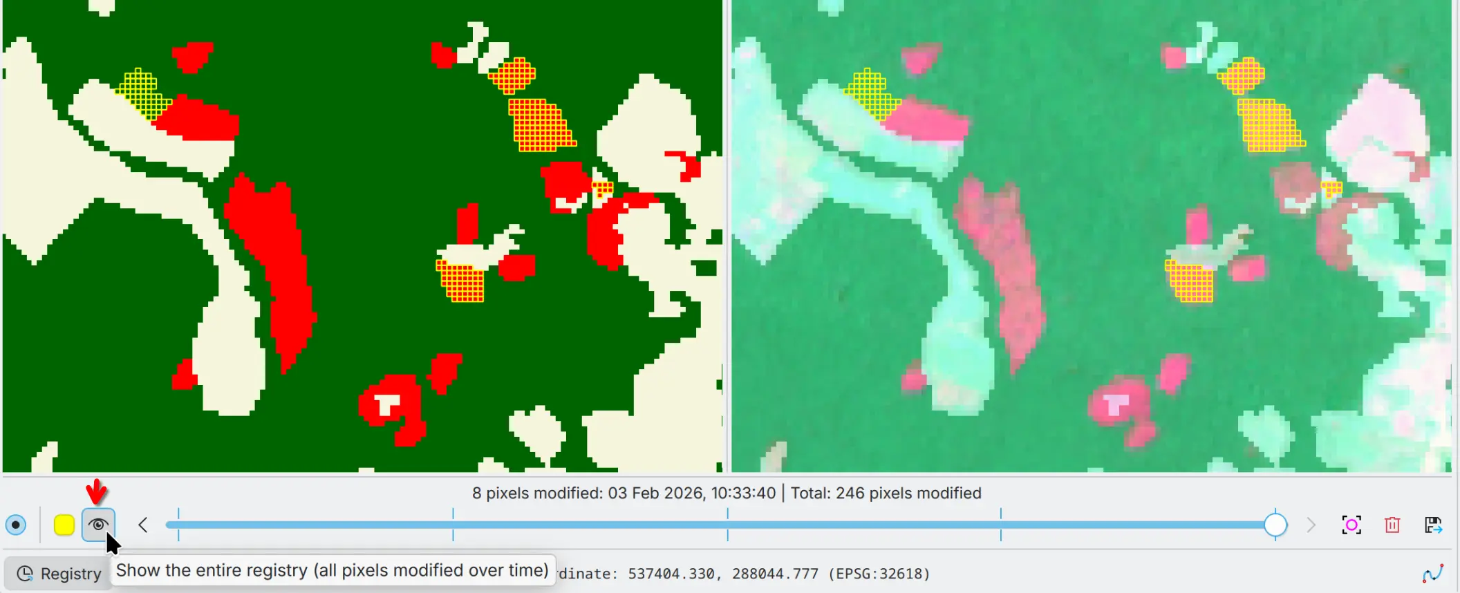 You can see the registry of the edits in the Registry widget. The registry is a list of the edits made to the thematic map. You can highlight the edited areas in the thematic map stored in the registry and navigate through the edits with the slider. You can also export the registry to a vector file with all pixel modifications, including original and new pixel values, and timestamps.